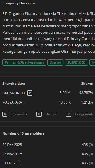 Sebagai informasi, sejak beberapa tahun terakhir, pengendali (Organon LLC) telah memiliki mayoritas mutlak saham (98,78%).