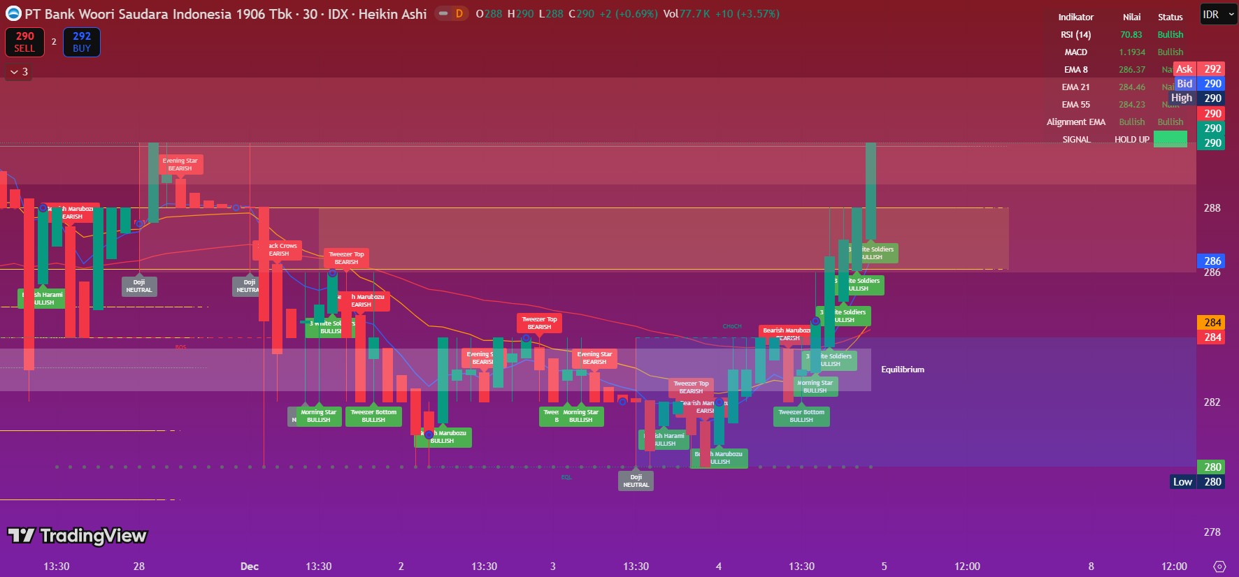 Harga saat ini bergerak sideways di atas EMA 55 (284.23), dengan momentum bullish masih terjaga: