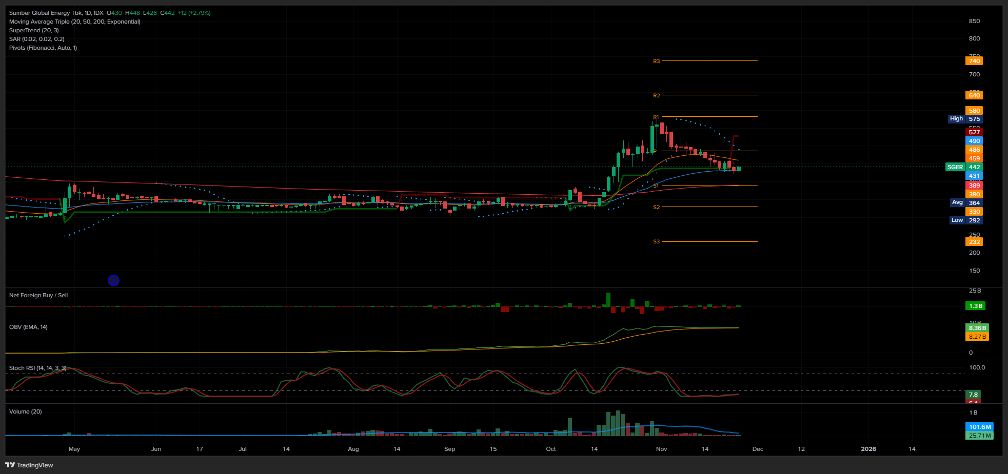 - SGER masih konsolidasi di range bawah, butuh volume untuk valid reversal