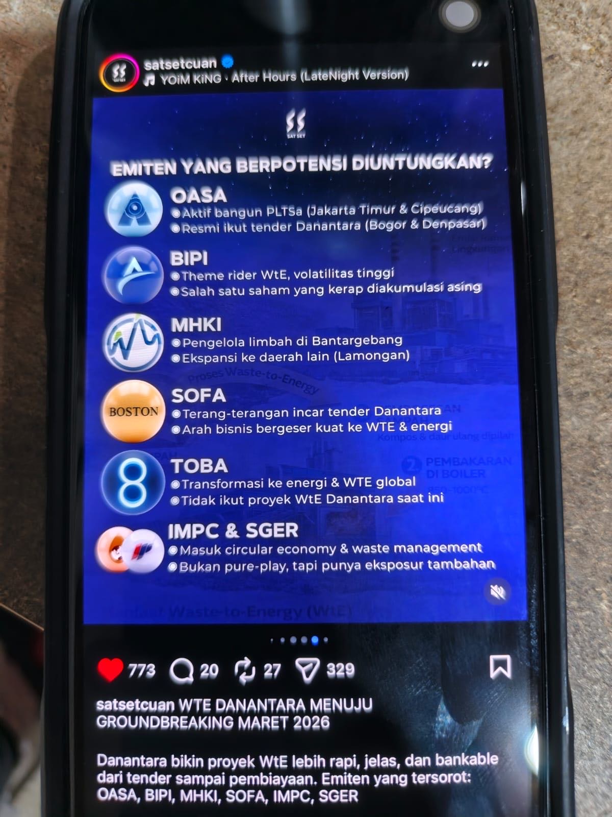 Proyek pengelolaan sampah menjadi energi listrik atau waste to energy disebut akan dimulai dengan pemancangan tiang pertama atau groundbreaking pada Maret 2026. Sentimen tersebut memberikan angin sejuk bagi sejumlah emiten bidang usaha WtE di pasar modal Indonesia.