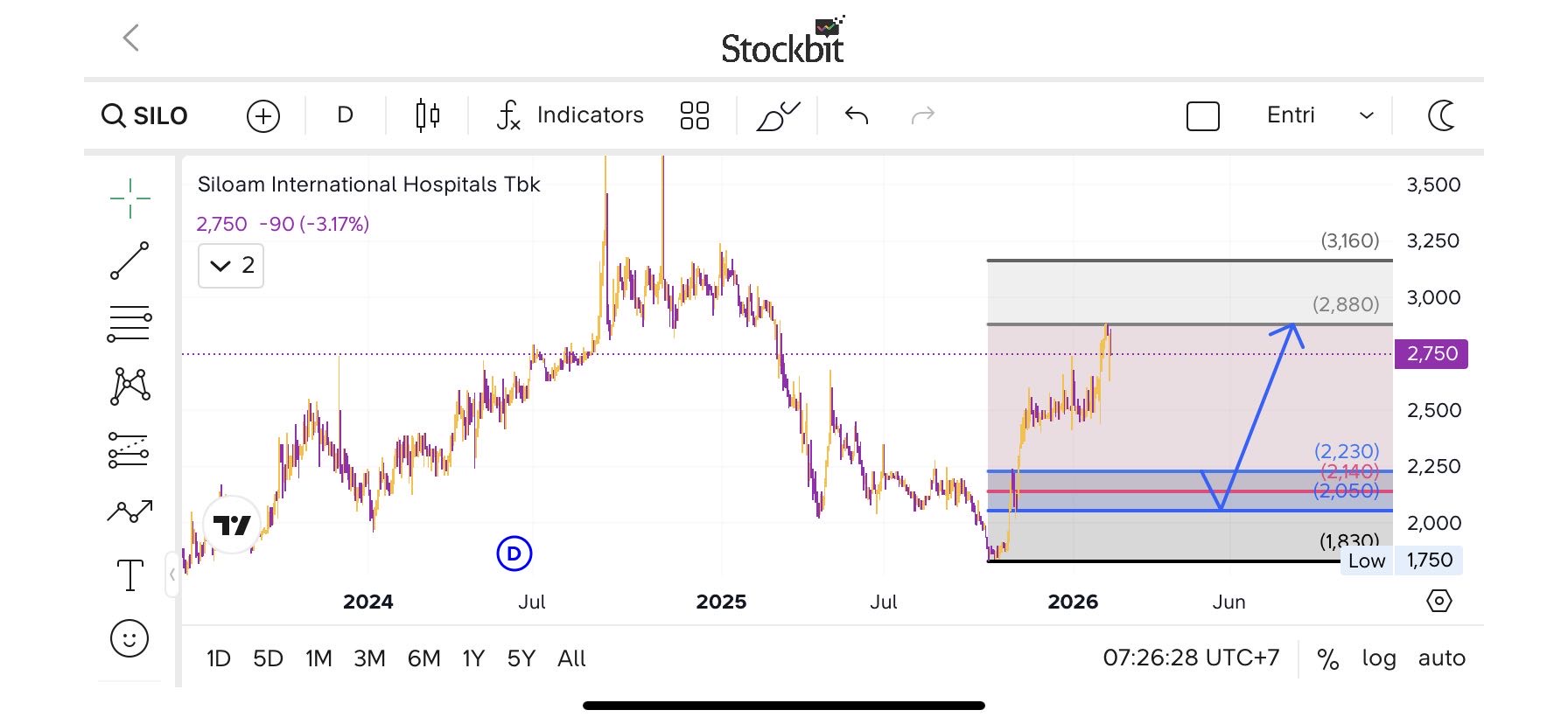 * **Strategi:** Lakukan cicil beli (*dollar cost averaging*) jika harga tertekan akibat sentimen berita asuransi. Fokus pada tesis bahwa SILO adalah pemimpin pasar untuk segmen pasien premium yang lebih tahan resesi (defensif).