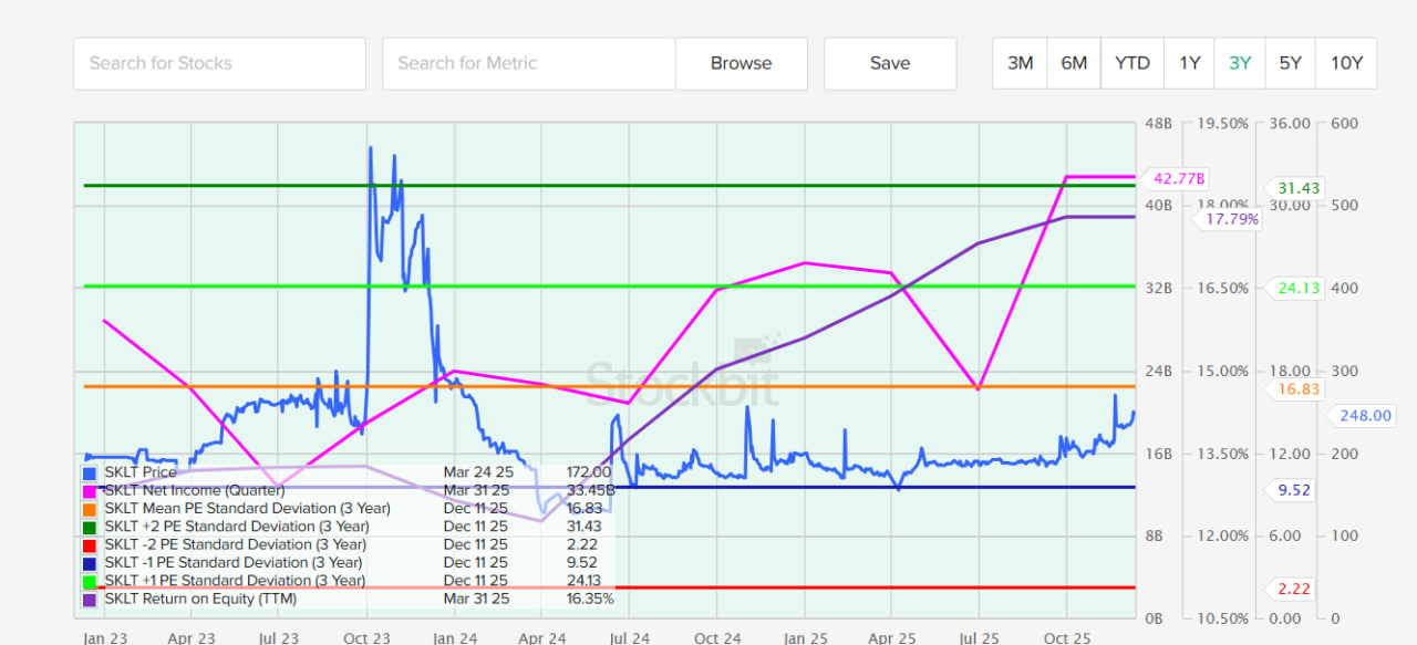 PT Sekar Laut Tbk (SKLT) adalah produsen makanan olahan dengan merek utama FINNA, mencakup kerupuk udang, saus, sambal, bumbu masak, roti, serta makanan ringan lainnya. Perusahaan berdiri sejak 1976 di Surabaya dan menjual produknya ke pasar domestik maupun ekspor ke berbagai negara. Kinerja keuangannya sangat solid pada 2024: pendapatan naik menjadi sekitar Rp2,29 triliun, laba bersih melonjak menjadi Rp109,7 miliar, aset dan ekuitas juga meningkat, dan arus kas operasi positif. Sahamnya memiliki P/E sekitar 9–10× dan dividend yield sekitar 4%, menunjukkan valuasi moderat dengan pembagian dividen stabil. Strategi pertumbuhan SKLT saat ini berfokus pada perluasan distribusi dalam negeri, peningkatan ekspor, serta pemanfaatan kapasitas produksi yang sudah besar tanpa ekspansi pabrik dalam waktu dekat. Meski prospek pertumbuhan masih baik, perusahaan tetap menghadapi risiko seperti persaingan ketat industri makanan, fluktuasi harga bahan baku, serta dinamika kepemilikan saham besar yang berubah pada 2024.
