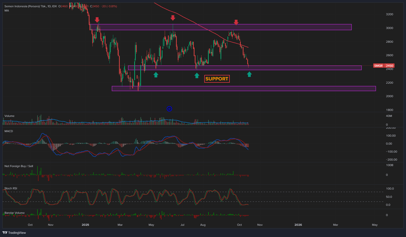 Dengan pangsa pasar sekitar 45% di penjualan semen nasional, SMGR berpotensi mencatatkan kinerja yang makin solid ke depannya — apalagi sekarang sudah berada di bawah naungan Danantara.
