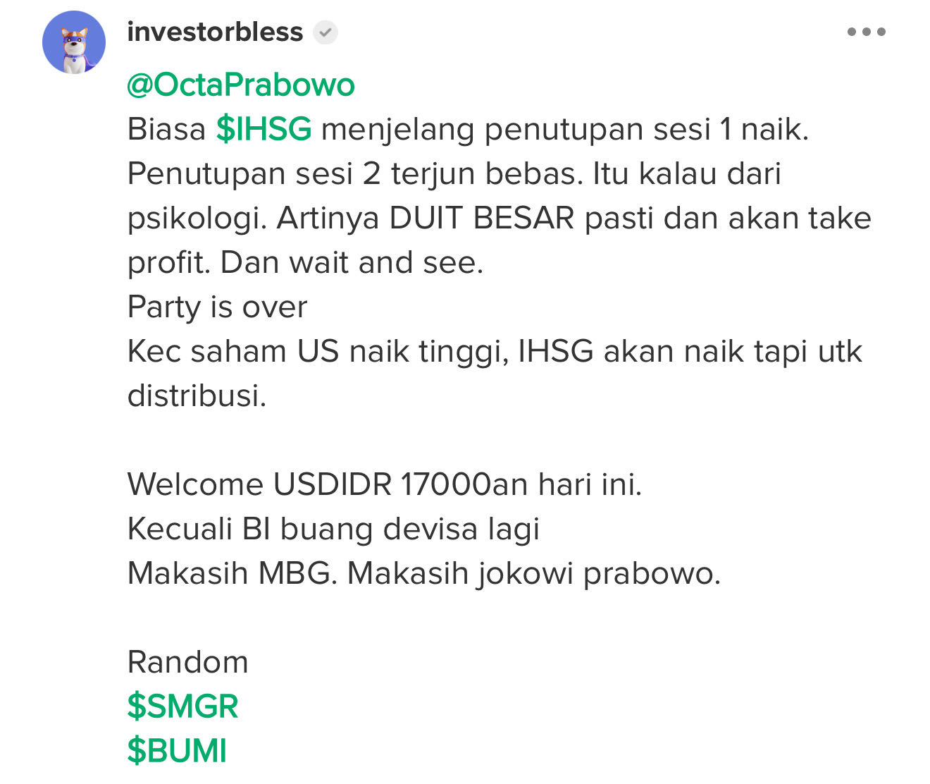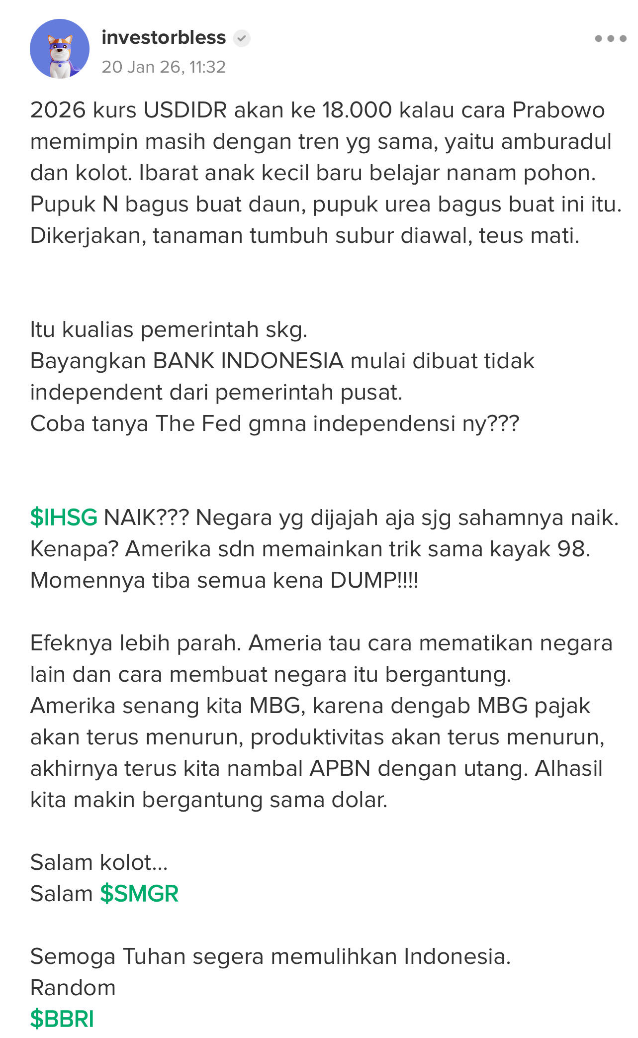 Soalnya semua kebijakannya uda aku kasih tau dampak nya, aku kasih saran masukan, malah dia kerjakan sebaliknya. Mbg itu buat kita makin bergantung pada dolar. Apa putbaya kolot atau emang sengaja.???