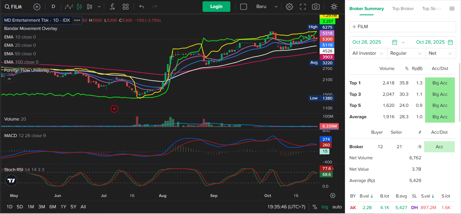 $FILM ditutup di 5.300 (-2,75%) dengan volume sedang (8,3M) dan akumulasi besar dari top broker (Big Acc). Meskipun harga mengalami koreksi minor, tren utama masih positif dengan posisi harga yang tetap di atas seluruh EMA utama — EMA 10 (5.318), EMA 20 (5.119), EMA 50 (4.526), dan EMA 100 (3.903) — menunjukkan tren menengah hingga panjang masih bullish.