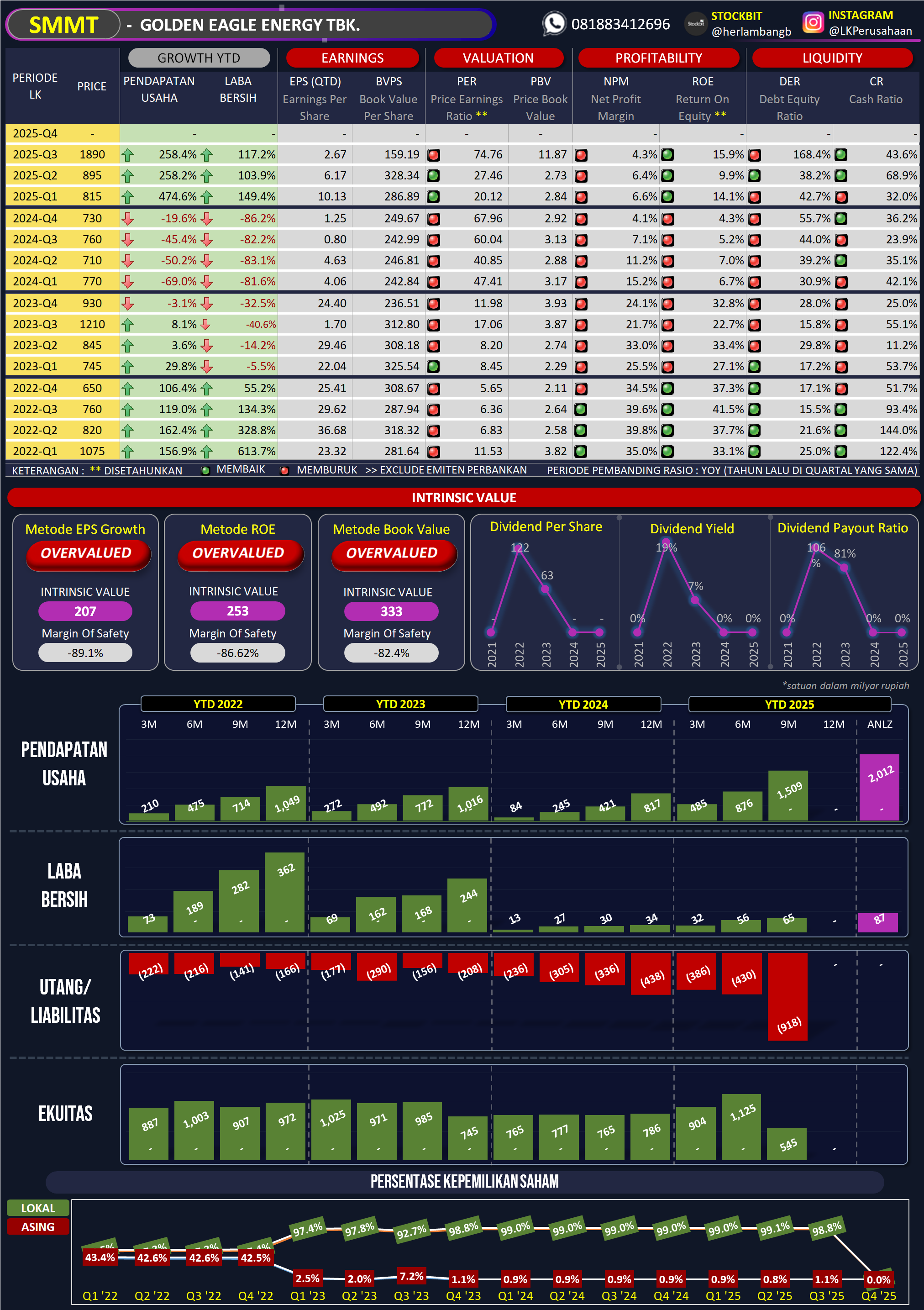 RoE & EPS masih negatif (turnaround mode), tren earning masih underperformance, risiko UMA/suspect price action & sentimen euforia, pernah alami suspensi volatilitas tinggi, net income masih minus YoY, PBV premium dan volume fluktuatif memperbesar risiko koreksi.β