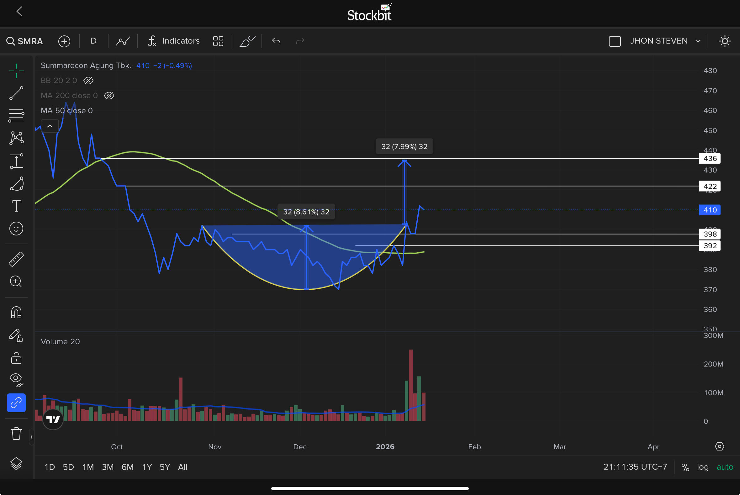 Terjadi lonjakan volume signifikan saat breakout dari 390 → validasi minat beli.