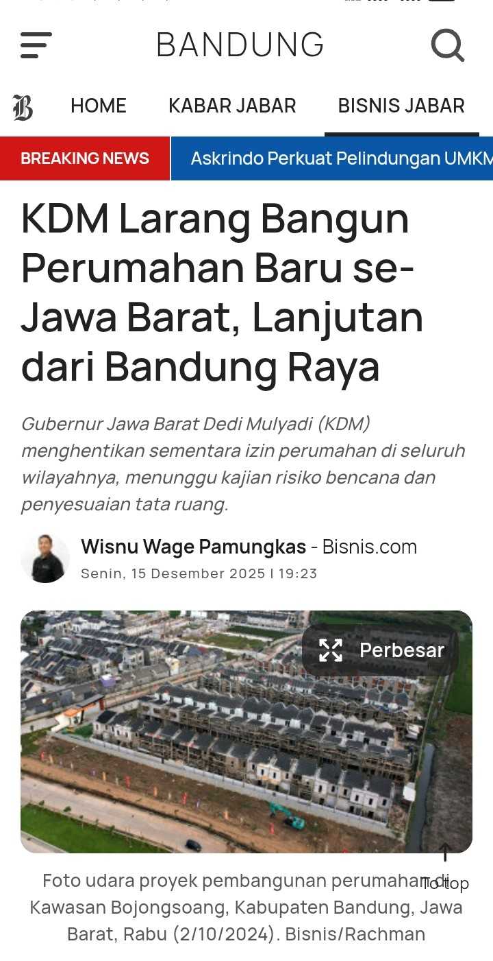 Pemberian izin perumahan baru dihentikan sementara, dari semula untuk wilayah Bandung Raya saja, kini jadi seluruh wilayah Jawa Barat
