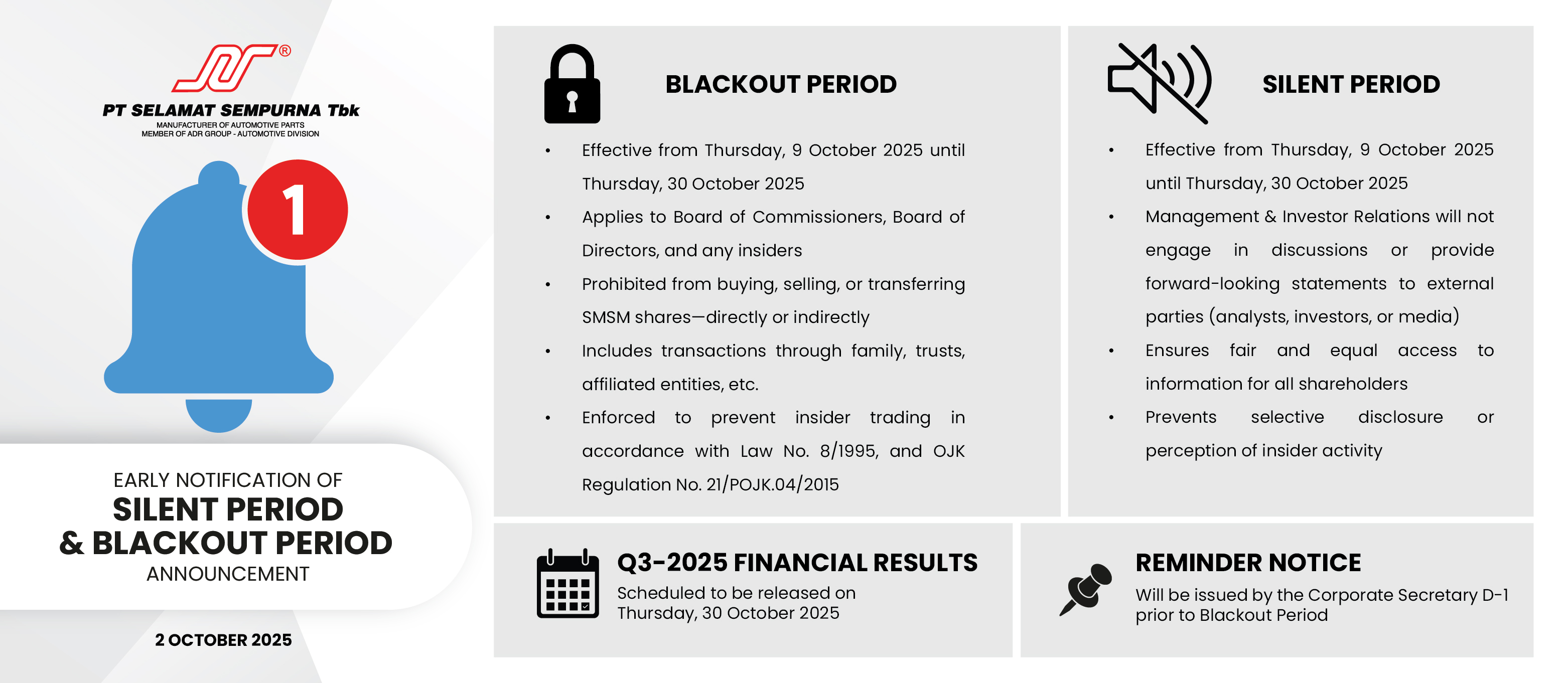 Please be informed that PT Selamat Sempurna Tbk has announced the upcoming Silent & Blackout Period, which will be in effect from 09–30 October 2025, ahead of the release of our Q3-2025 Consolidated Financial Statements scheduled on 30 October 2025.