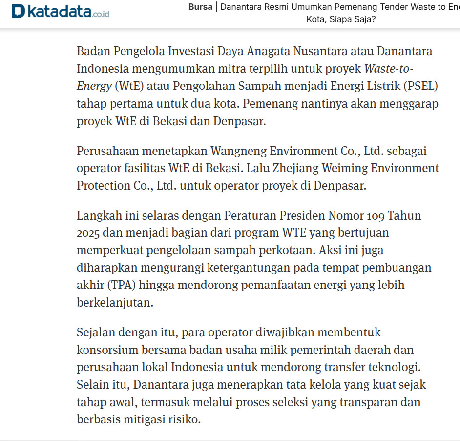 Analisa cupu spekulatif kalau dari kacamata saya terkait siapa kira2 mitra lokal yang akan berperan untuk proyek WTE (Waste to Energy)