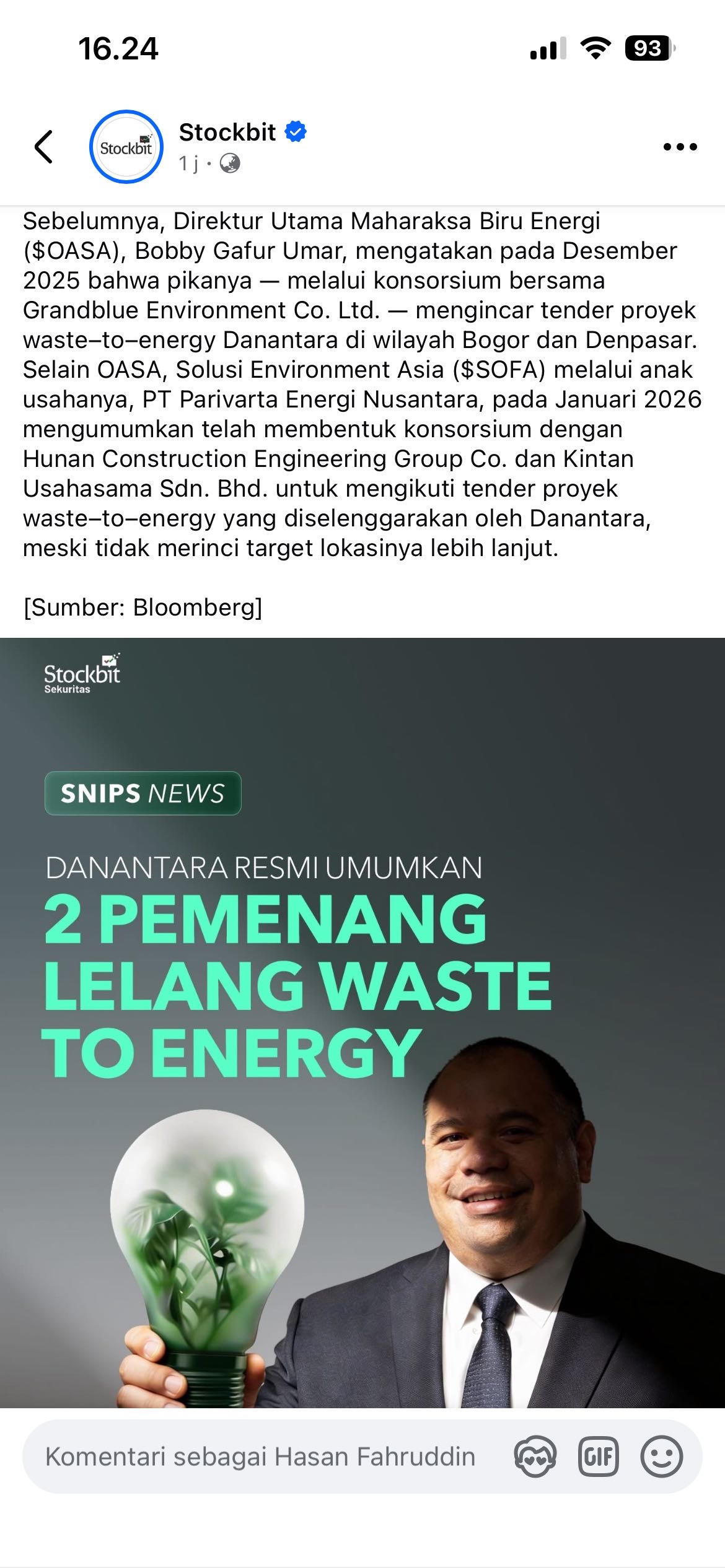 Sebelumnya, Direktur Utama Maharaksa Biru Energi ($OASA), Bobby Gafur Umar, mengatakan pada Desember 2025 bahwa pikanya ā melalui konsorsium bersama Grandblue Environment Co. Ltd. ā mengincar tender proyek wasteātoāenergy Danantara di wilayah Bogor dan Denpasar.