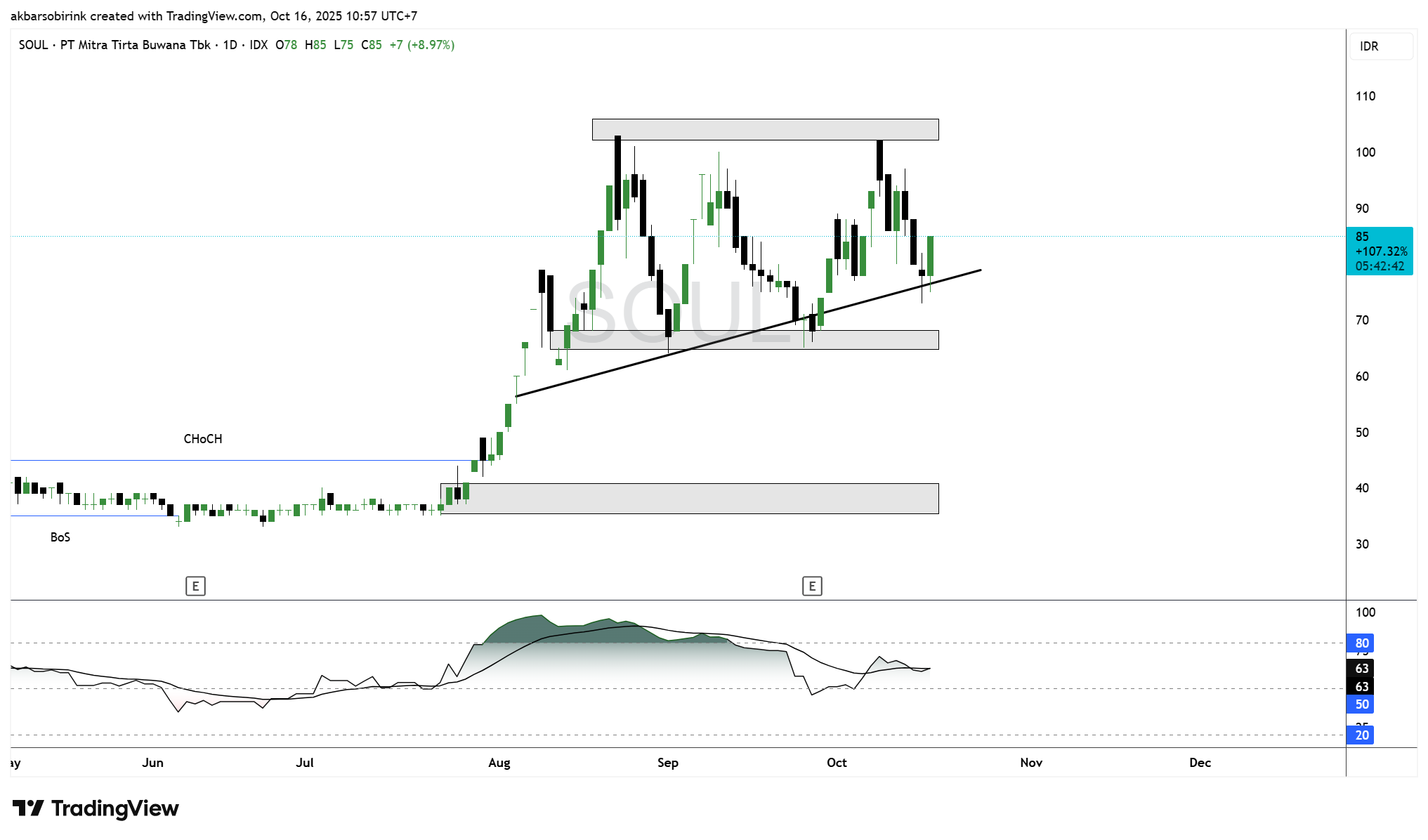 Bus SOUL (PT Mitra Tirta Buwana Tbk) ini adalah Bus yang Sering Pulang-Pergi (pergerakan sideways). Dia terus-menerus mantul antara ATAP (Resisten) di 100-an dan LANTAI (Support Trendline). Saat ini, dia baru saja mantul ideal dari LANTAI (Trendline)!