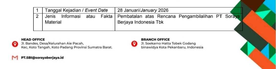 $SPRE Rencana pengambilalihan PT Soraya Berjaya Indonesia Tbk oleh Saiko Consultancy Pte. Ltd. dibatalkan. Pembatalan ini dilakukan setelah adanya klarifikasi dari Bursa Efek Indonesia terkait komitmen pengendali saat IPO, di mana Rizet Ramawi wajib tetap menjadi pengendali dan bagian dari manajemen/komisaris selama minimal 5 tahun sejak pencatatan saham (3 Juli 2024). Rizet Ramawi menegaskan tetap memegang komitmen tersebut, sehingga Saiko Consultancy saat ini hanya melakukan diskusi struktur alternatif dan tidak melanjutkan pengambilalihan hingga ada pemberitahuan lebih lanjut.