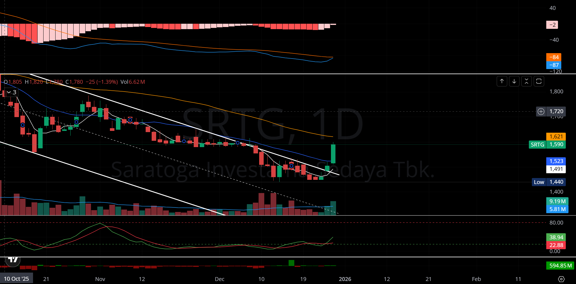 $SRTG sudah mulai menarik, udah break channel resistennya. Walaupun MA 5 masih dibawah MA 20 dan 60, indkator stochastic sudah memasuki area buy.