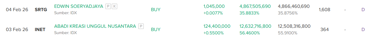 $SRTG: Pengendali sekaligus Komisaris Utama Saratoga Investama Sedaya, Edwin Soeryadjaya, membeli ~1,5 juta saham SRTG dengan harga rata–rata Rp1.615/lembar atau senilai total ~Rp2,5 M pada 2–4 Februari 2026. Setelah transaksi ini, porsi kepemilikan saham Edwin Soeryadjaya di SRTG naik dari ~35,87% menjadi ~35,88%.
