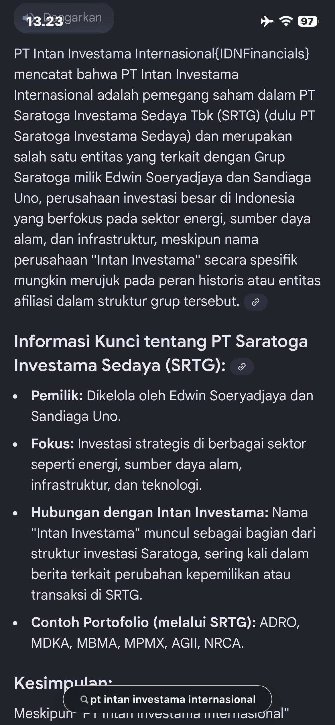 PT Saratoga Investama Sedaya Tbk merupakan perusahaan yang bergerak dalam bidang investasi. Perusahaan berinvestasi dalam tiga sektor; konsumen, infrastruktur, dan sumber daya alam. Portofolio investasi sumber daya alamnya termasuk perusahaan yang bergerak dalam industri batu bara, seperti PT Adaro Energy Tbk; perkebunan minyak kelapa sawit, seperti PT Provident Agro Tbk; eksplorasi gas dan minyak bumi, seperti Interra Resources Ltd, dan pertambangan tembaga dan emas, seperti Sihayo Gold Ltd. Portofolio investasi infrastrukturnya mencakup perusahaan yang bergerak dalam penyewaan menara telekomunikasi, seperti PT Tower Bersama In... Read More