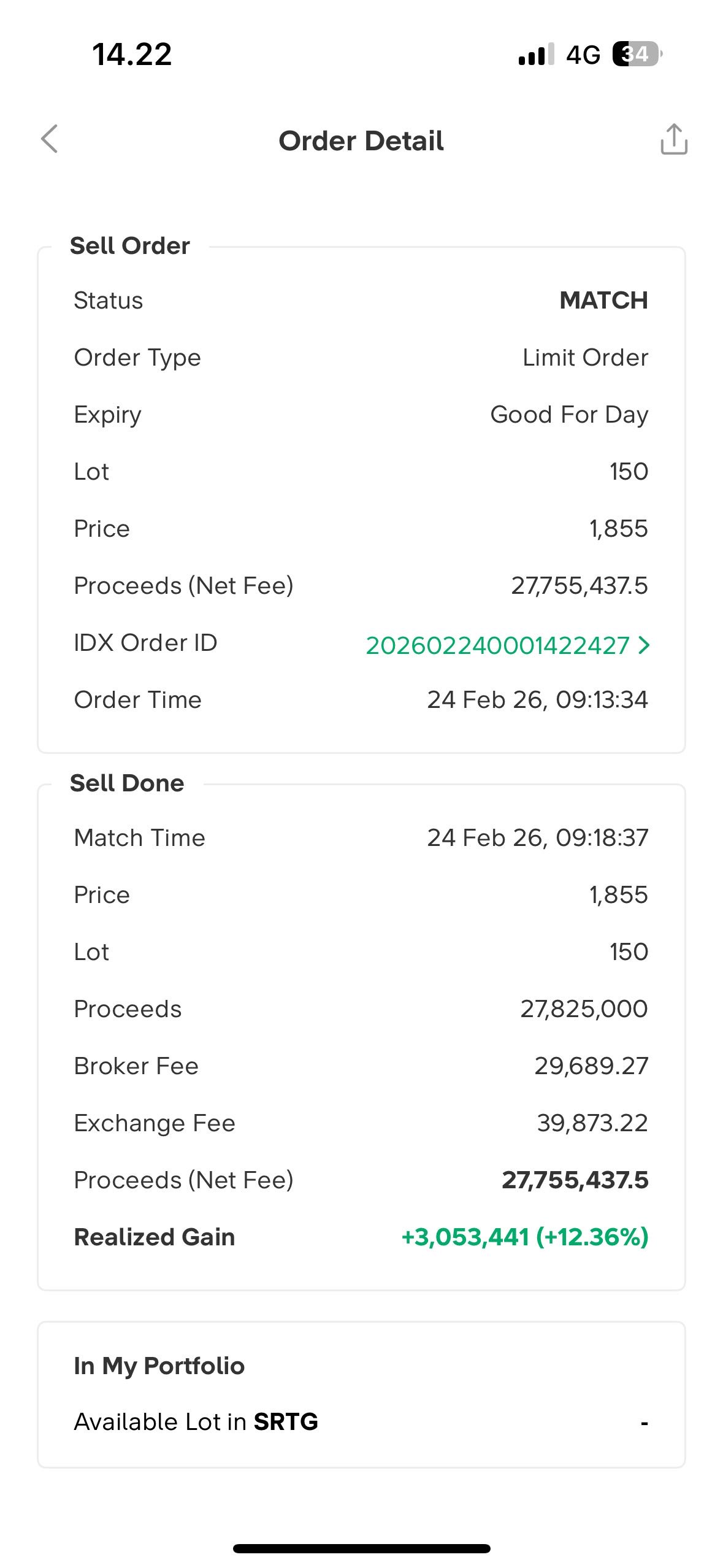 $SRTG karna sudah lama mengendap, akhirnya aku nambah muatan dan pelan pelan ngurangin minus sebelum di sell (paling ga suka CL karna bisa bikin winrate porto turun wkwk)😓😓