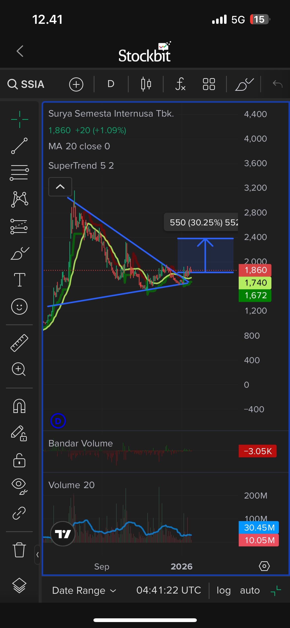 Pesan Kunci: SSIA baru saja lolos dari lubang jarum (POC 1.842). Momentum ini bisa membawanya menguji 1.950 dalam waktu dekat. Perhatikan volume; jika volume terus naik, breakout 1.950 sangat mungkin terjadi.