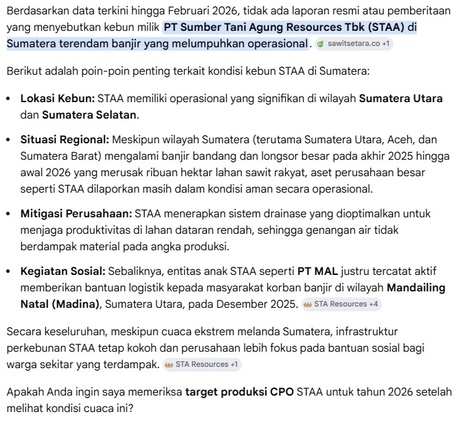 masalahnya $STAA, ada kebun yang kerendam banjir sumatera bang. masih pada wait n see impactnya ke lapkeu