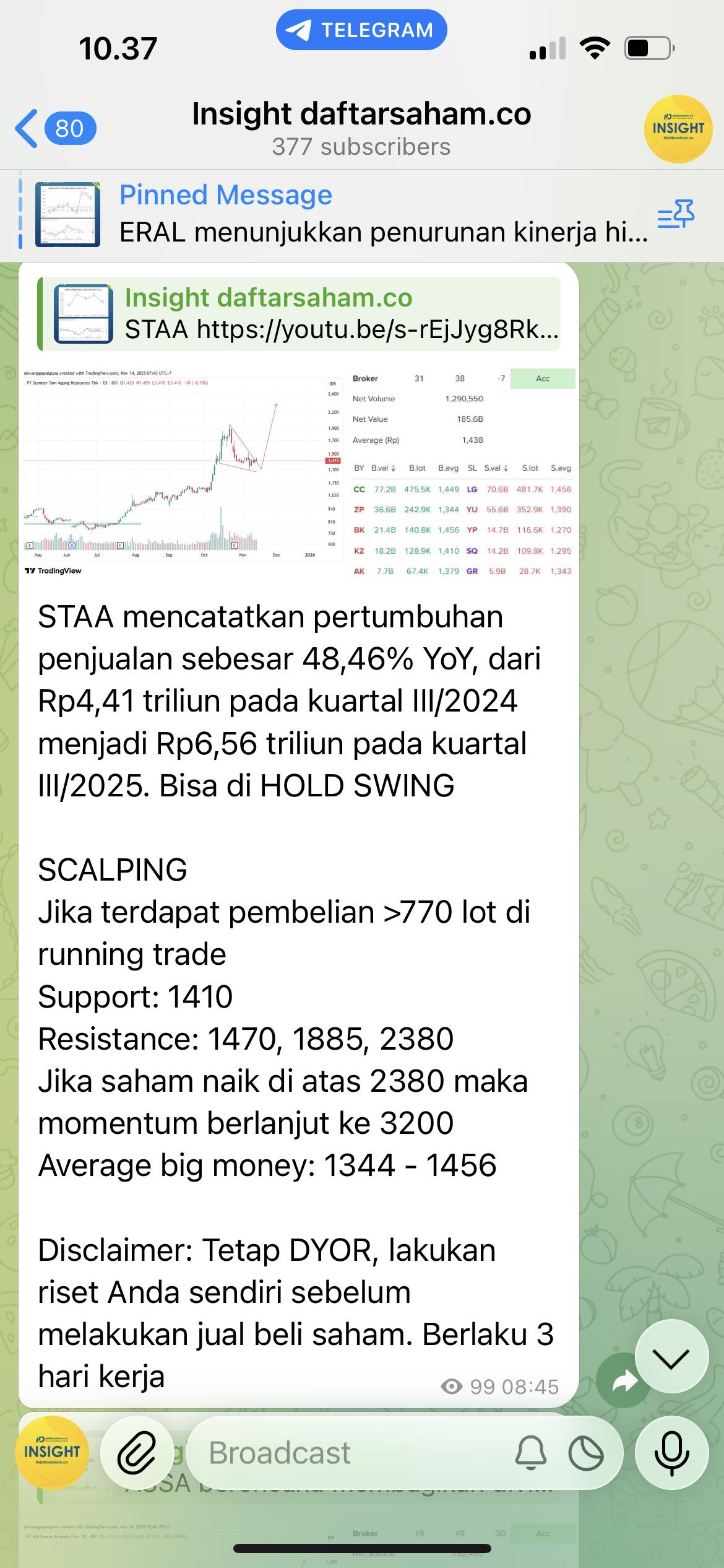 CPO ke depannya hilirisasinya makin banyak dan makin valuable. $STAA bulan lalu pas koreksi saya average up terlalu cepat, jadi akhir pekan lalu saya cicil lagi selot-selot. Dua sekawan ini mungkin akan ketemu lagi kompak di harga 1600 ke bawah