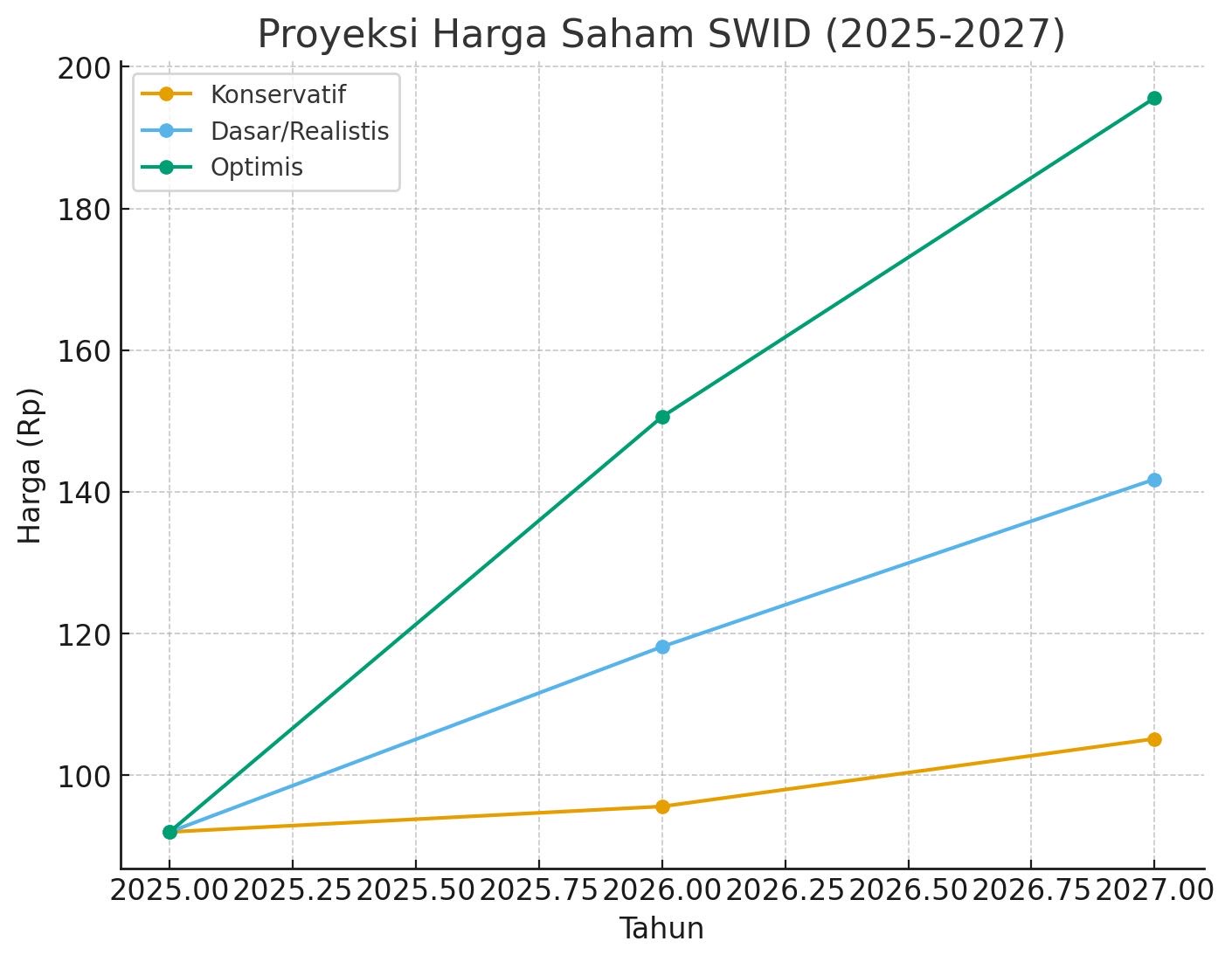 Berikut grafik proyeksi harga saham SWID untuk 2025β2027 dengan tiga skenario (Konservatif, Dasar/Realistis, dan Optimis).Β