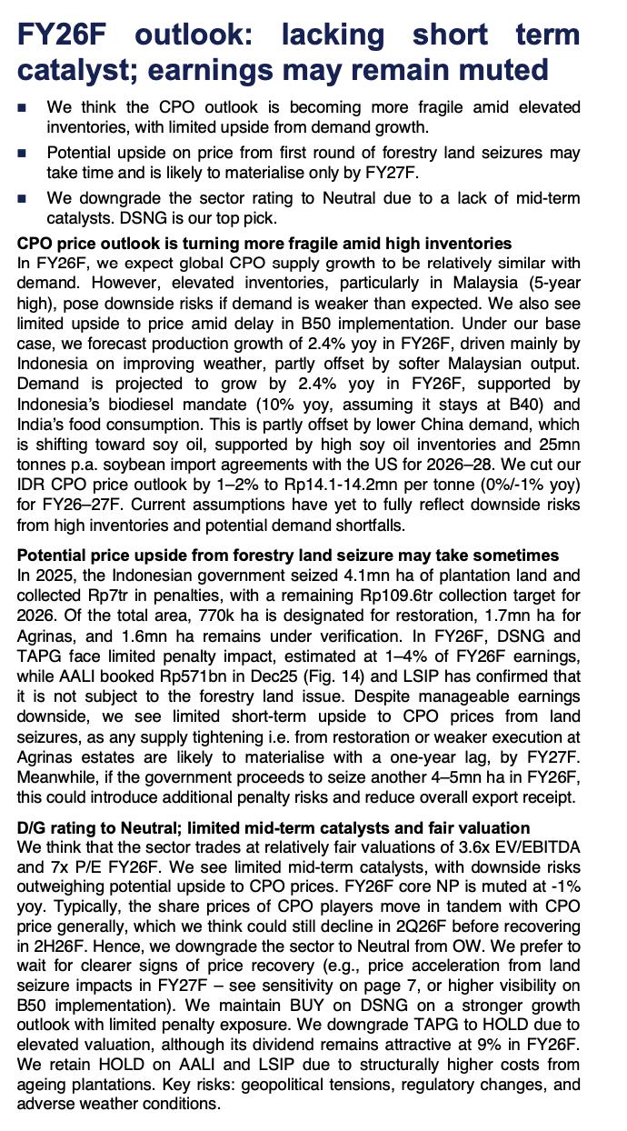 Sektor CPO diturunkan ratingnya menjadi Neutral karena kurangnya katalis jangka pendek dan tingginya inventori di Malaysia, dengan estimasi harga CPO dipangkas ke Rp14,1–14,2 juta per ton. Meskipun ada potensi pengetatan pasokan dari penyitaan lahan hutan seluas 4,1 juta ha, dampaknya baru akan terasa di FY27, sehingga saham seperti DSNG lebih disukai sementara $TAPG , $AALI , dan $LSIP diberi rating Hold.