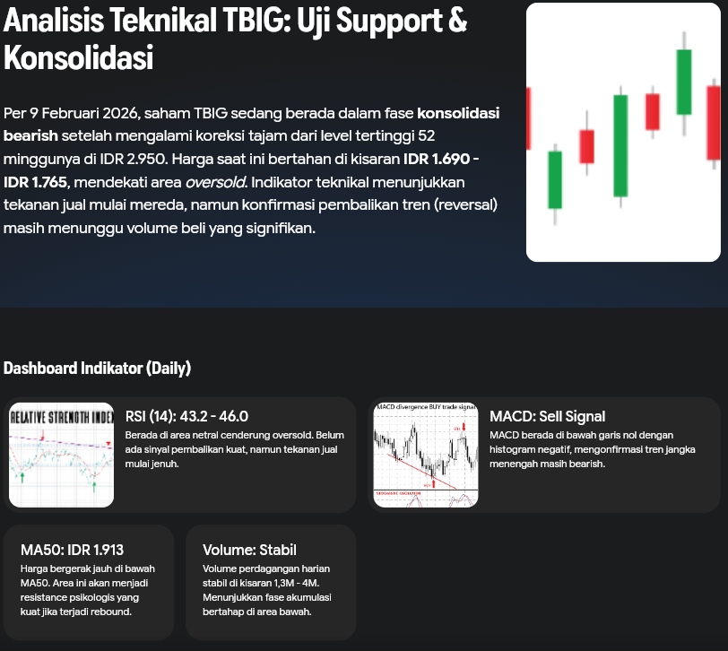 - Selama TBIG bertahan di atas support kunci 1.650, peluang swing ke area 1.850–1.930 masih terbuka.