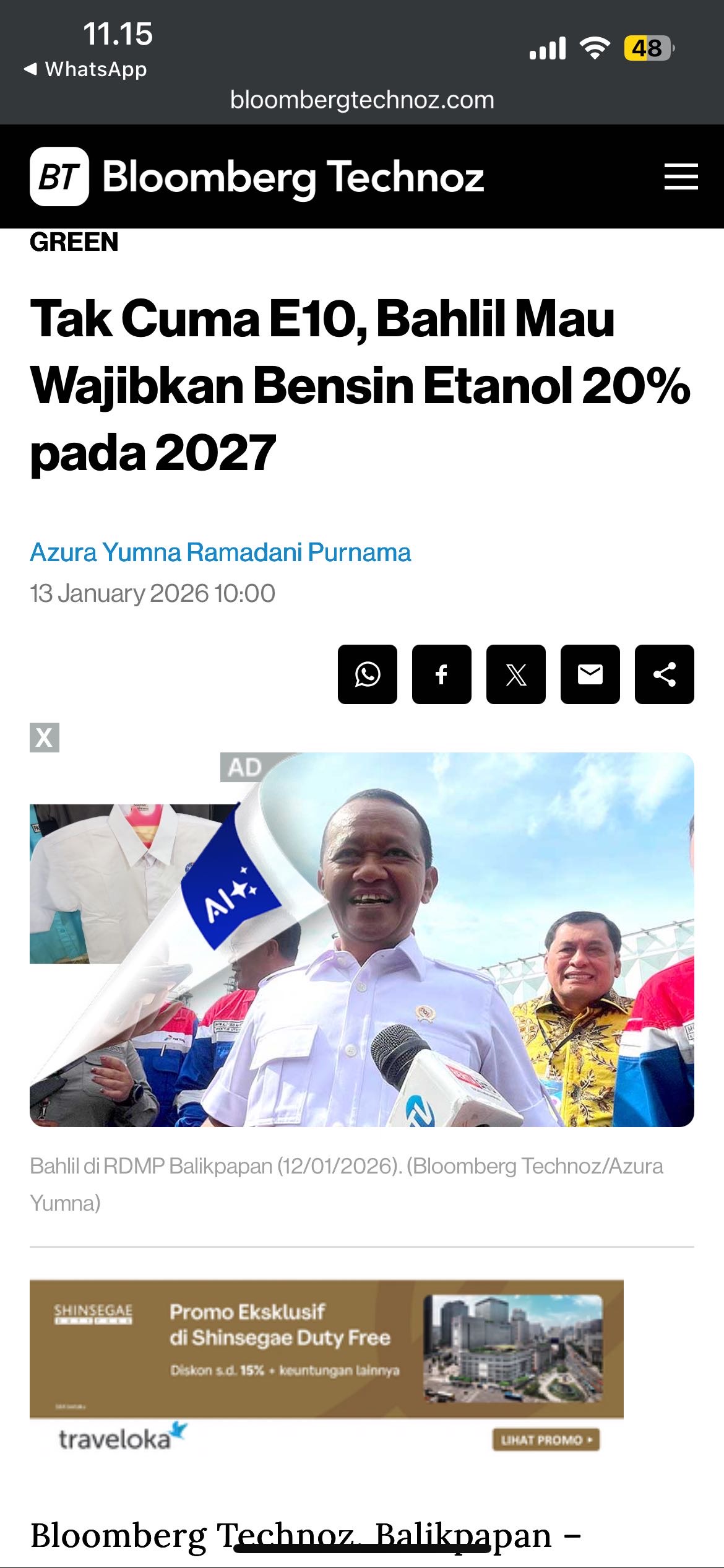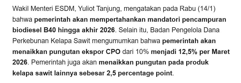 * Wakil Menteri ESDM, Yuliot Tanjung, mengatakan pada Rabu (14/1) bahwa pemerintah akan mempertahankan mandatori pencampuran biodiesel B40 hingga akhir 2026, berubah dari rencana awal di mana pemerintah menyebut mandatori B50 akan diluncurkan pada 2H26.