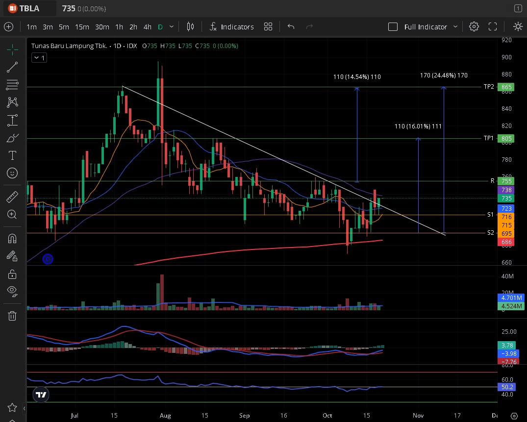 Saat ini TBLA sedang bergerak di range sideways lebar, dengan dua area penting yang sudah terbentuk kuat: