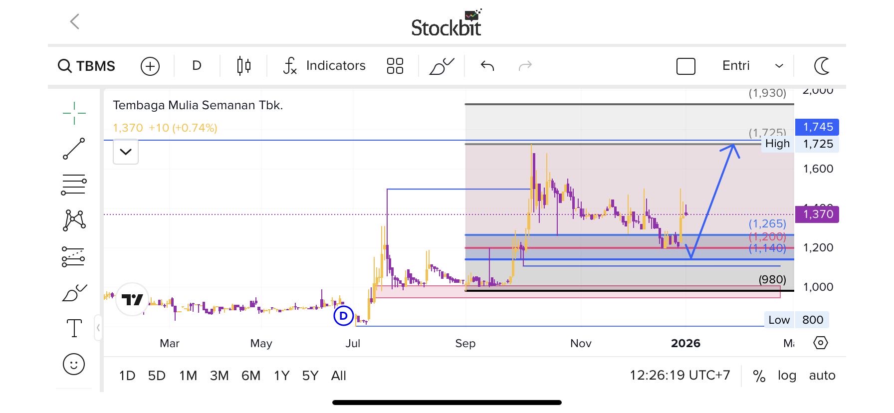 TP1: Rp420 (+14.75% dari entry agresif Rp366)