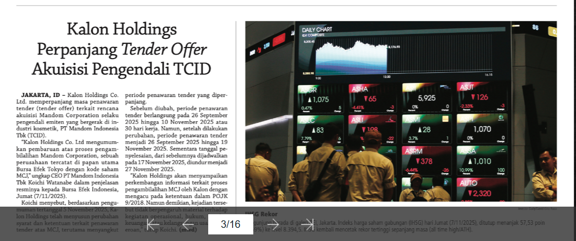 JAKARTA - Kalon Holdings Co., Ltd memperpanjang masa tender offer atas saham Mandom Corporation, induk PT Mandom Indonesia Tbk (TCID).