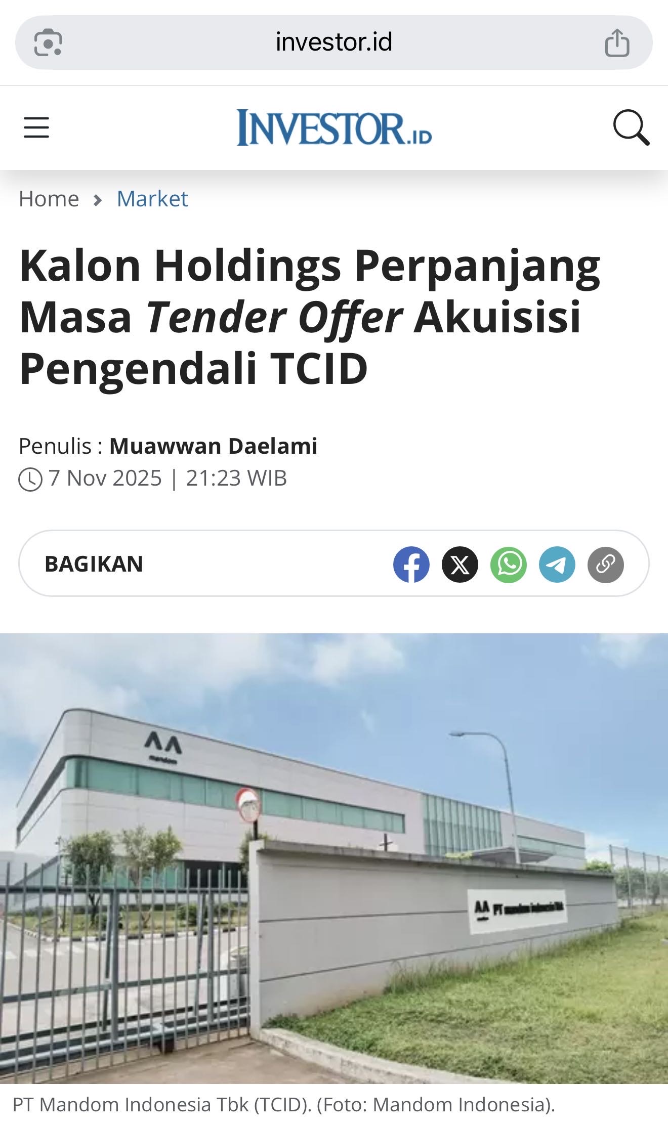 Lonjakan ini terjadi setelah perseroan merilis pembaruan informasi material terkait proses akuisisi Mandom Corporation Jepang, pemegang 65,23 persen saham TCID, oleh Kalon ...