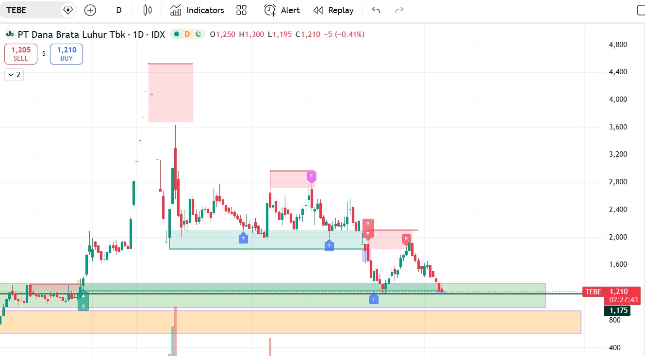 $TEBE buat sangkuter ku bantu sedikit maping, 975-1175 area buy. SL di < 950, kl sampe kejebol/close dibawah 950 potensi ke 610-800an. kl untuk hari ini tunggu harga close bagusnya. tp kl mau coba re entry SL di 1160. selamat mencoba