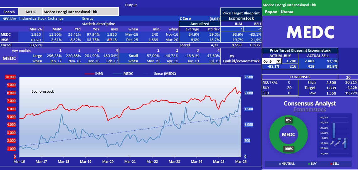 Terlihat dominan BUY (100%) dengan target analis di atas harga saat ini.