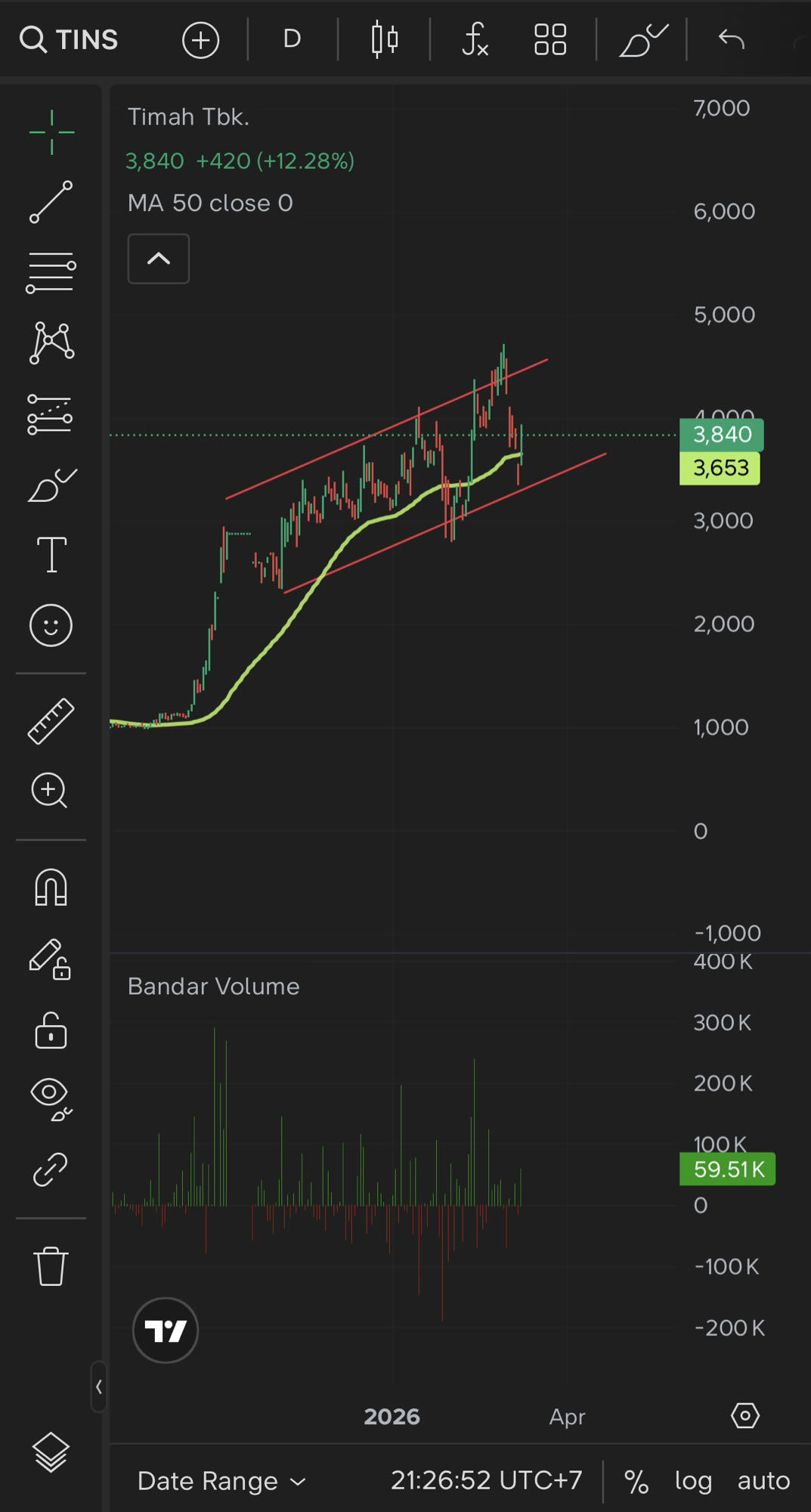 Indikator MA 50: Harga berada di atas garis MA 50 (3.653), yang menunjukkan tren jangka menengah masih sangat terjaga dan garis tersebut berfungsi sebagai dynamic support.