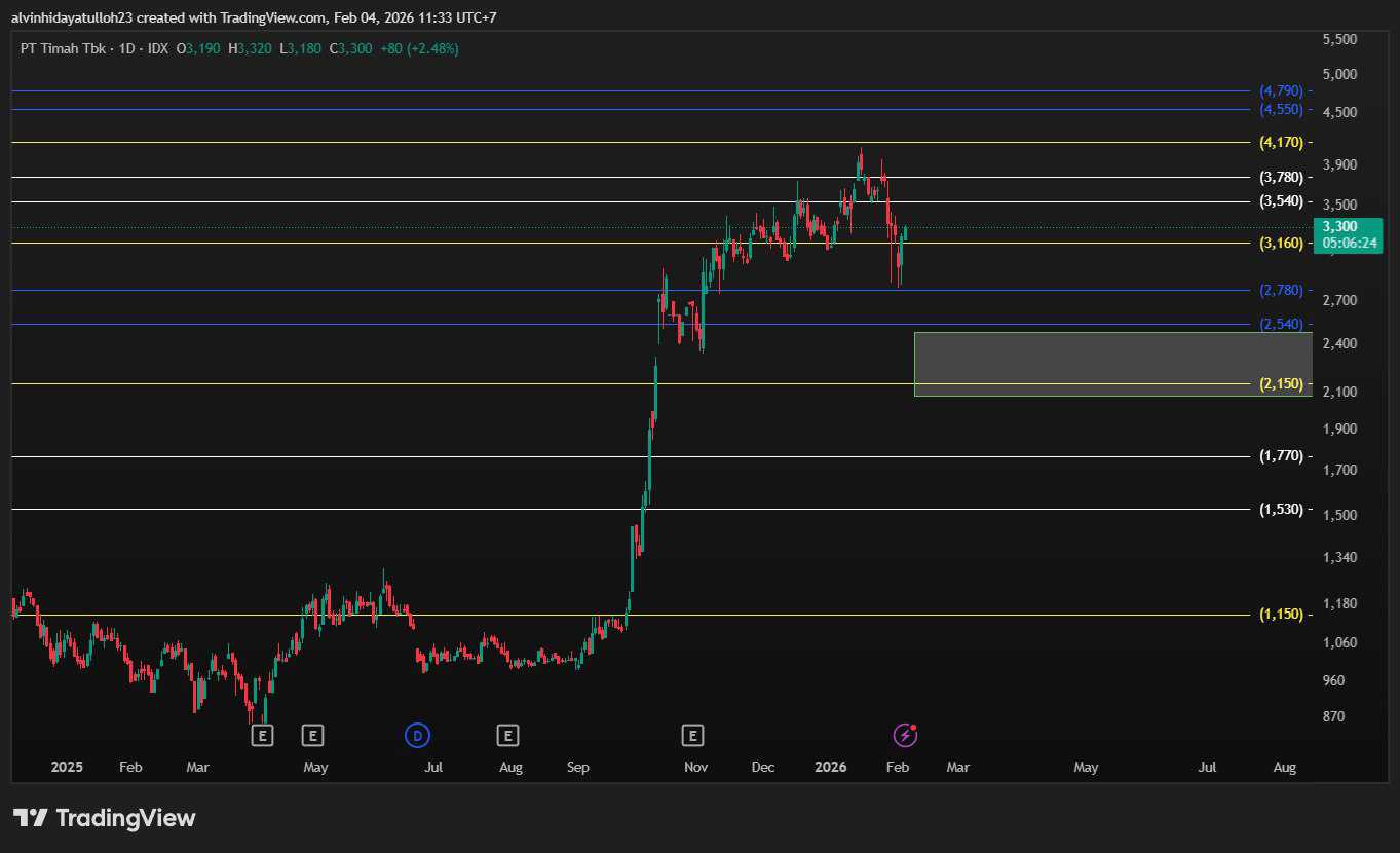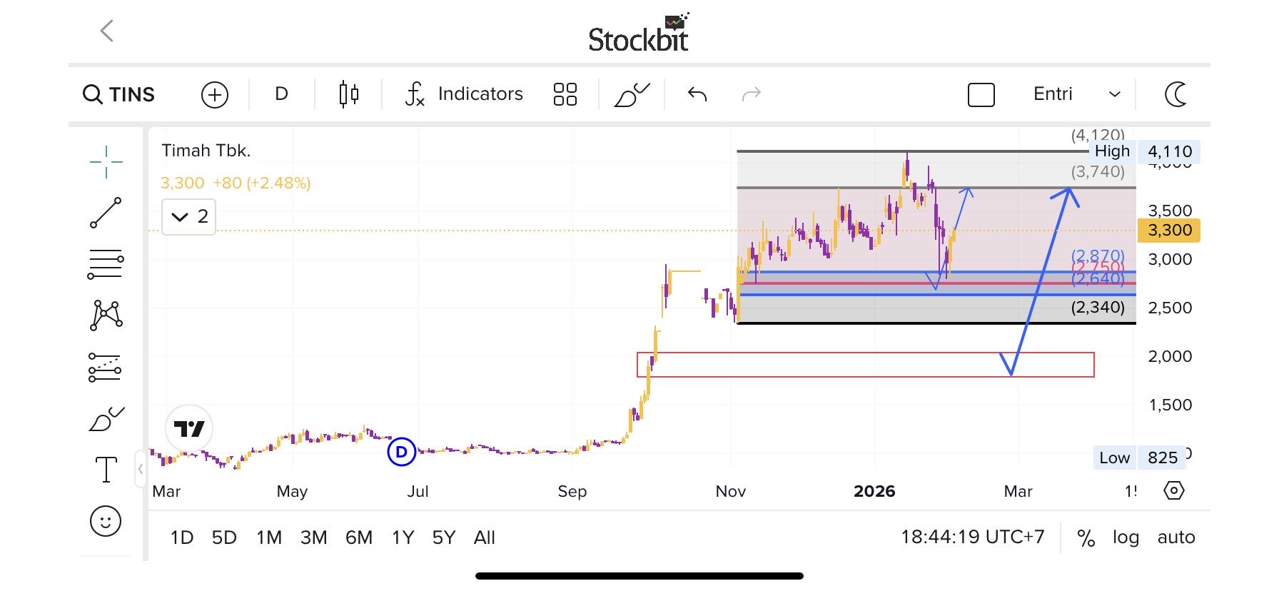 - Selama TINS bertahan di atas support kunci 2.900, peluang swing ke area 3.300–3.550 masih terbuka.