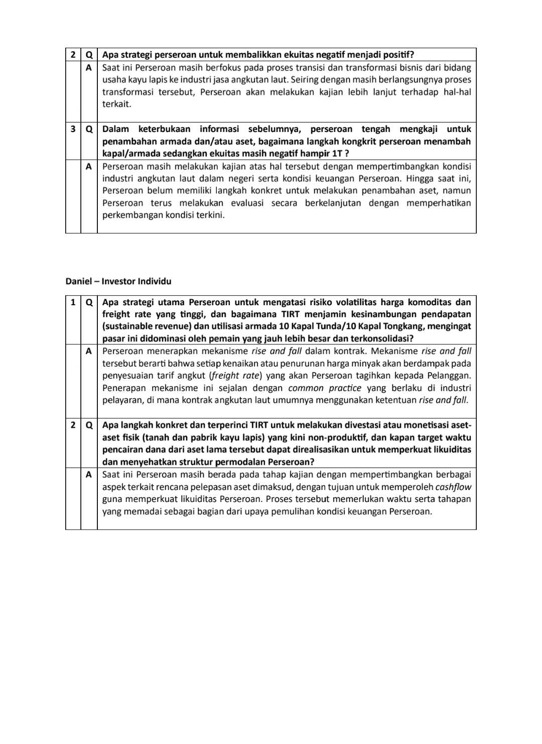 $TIRT masih berada pada fase awal turnaround dengan risiko tinggi. Pendapatan baru mulai terbentuk, ekuitas masih negatif, dan belum ada langkah konkret penyehatan neraca maupun ekspansi. Prospek sangat bergantung pada keberlanjutan kontrak dan realisasi transformasi bisnis.