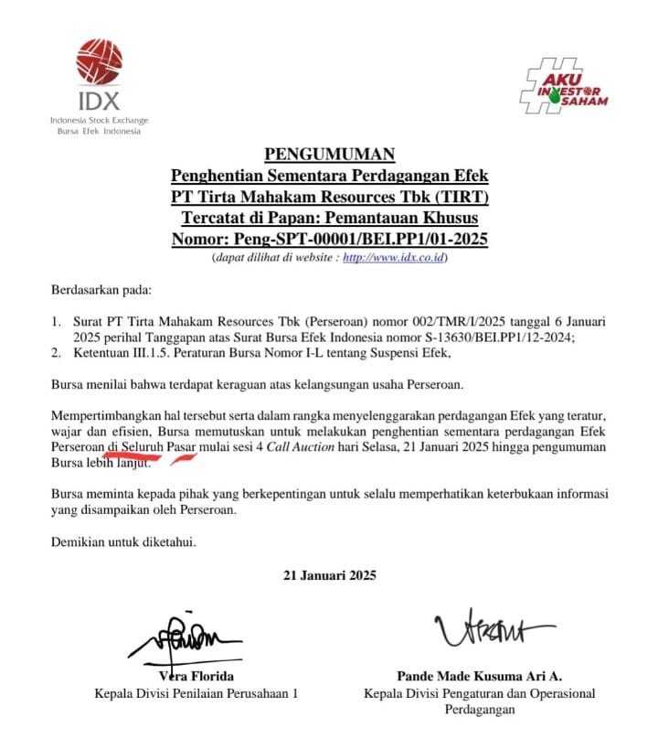 Silahkan lakukan case study untuk emiten yang sedang suspend yang memiliki risk reward yang sangat besar: $TOPS $TIRT $ARTI