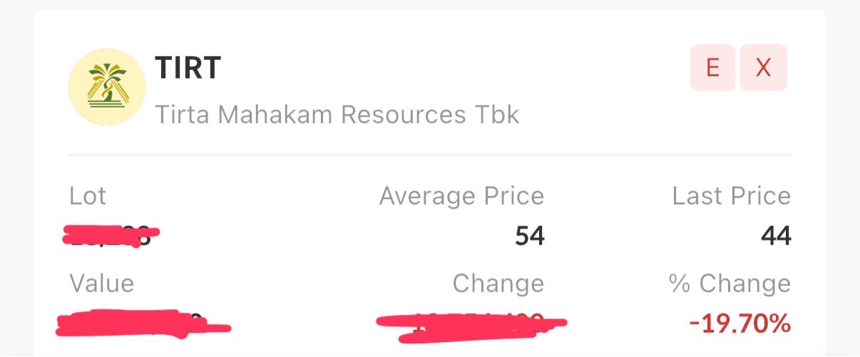 cerita beli $TIRT di tahun lalu, avg harga 54, lot lumayan banyak karna yakin nih perusahaan gak mungkin ditinggalin kosong ama yang punya, yang mau tahu prospek nya like banyak2 biar gw share sesuai analisis pribadi hehe 馃 *dyor