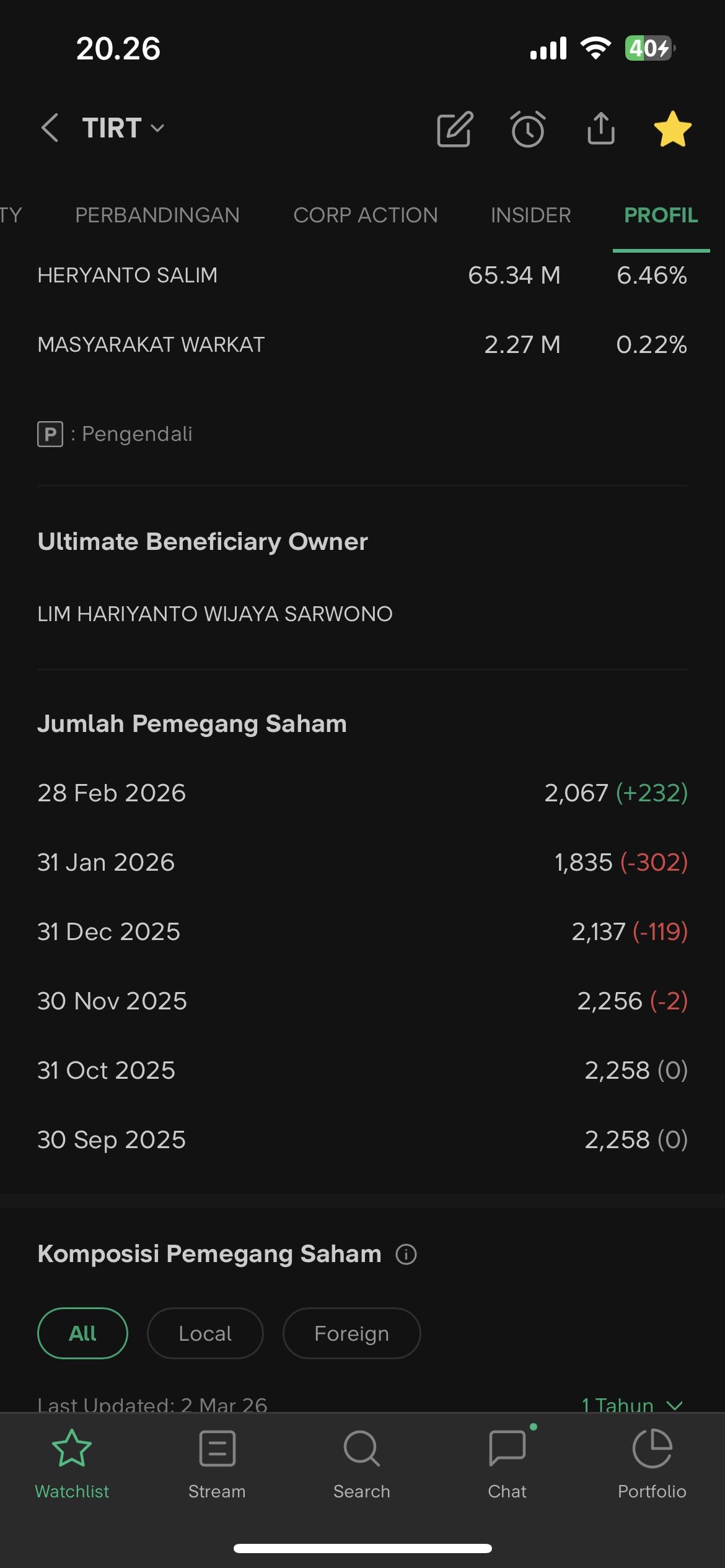 yang megang barang $PPRO pinter tau barang bagus, dilepas dikit dikit, seperti $TIRT, bisa sampai 1.000, ndar bagi barang,...wkwkwk... dikejar ritel... kalo lilepas banyak bisa kena guyur....junam.....mungkin Mamang Ganteng nyesel lepas barang....