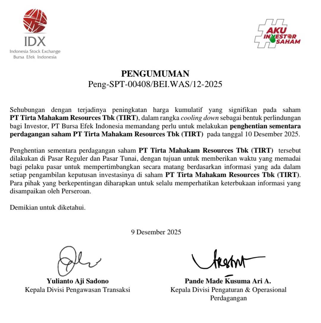 Suspensi ini berlaku efektif mulai hari ini, Rabu (10/12/2025). Tiga emiten yang terkena βgembo...