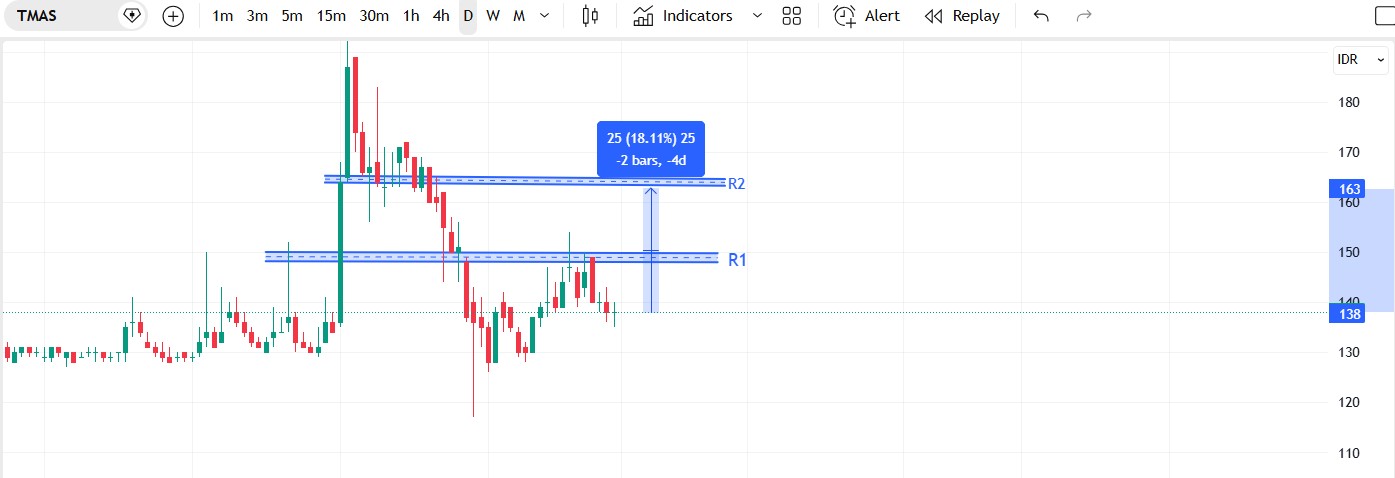 Daily chart menunjukkan TMAS sempat spike tajam ke area 190ā200 di awal 2026, lalu turun tajam kembali ke 130āan dan sekarang bergerak sideways dalam rectangle 120ā200 dengan harga terakhir sekitar Rp140 (penurunan ā4,11% pada 24 Februari).
