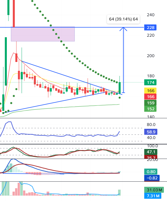 Hari ini sesuai gambar sudah BO dengan volume besar. RSI dan MACD sudah golder cross. Tinggal tentukan titik entri yang baik ya. Kalo bisa di 164 enak. Target TP tutup gap 228 tapi belum tau kapan. Ini ada dorongan sell kemungkinan orang2 sangkut mau pada out dulu sebelum melanjutkan kenaikan diisi oleh orang2 baru.