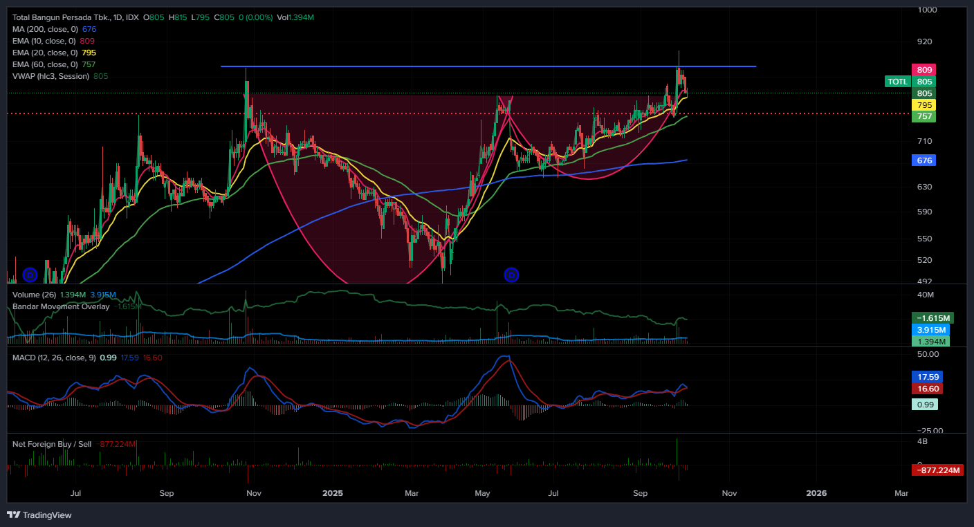 Kesimpulan: Belum ada strong momentum naik (kondisi netral-bullish), sideways menanti breakout volume. Validasi breakout >830 baru berubah strong bullish.