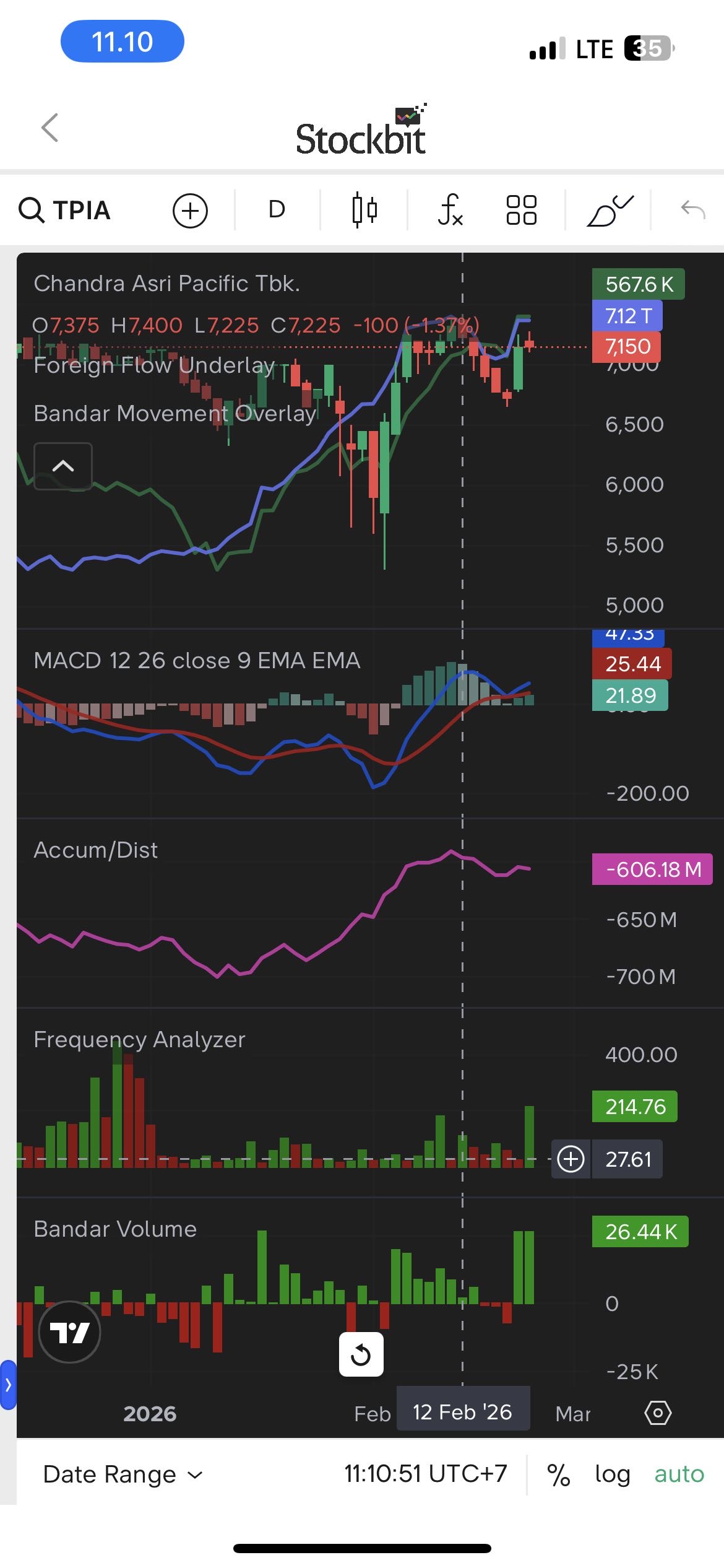 Saham TPIA saat ini berada dalam kendali penuh institusi ("Smart Money"). Pantulan harga di Fibonacci 6650 terbukti valid karena diiringi dengan mengeringnya tekanan jual (Supply Exhaustion), dan ledakan breakout ke 7150 hari ini disokong secara agresif oleh masuknya modal Asing dalam jumlah jumbo.