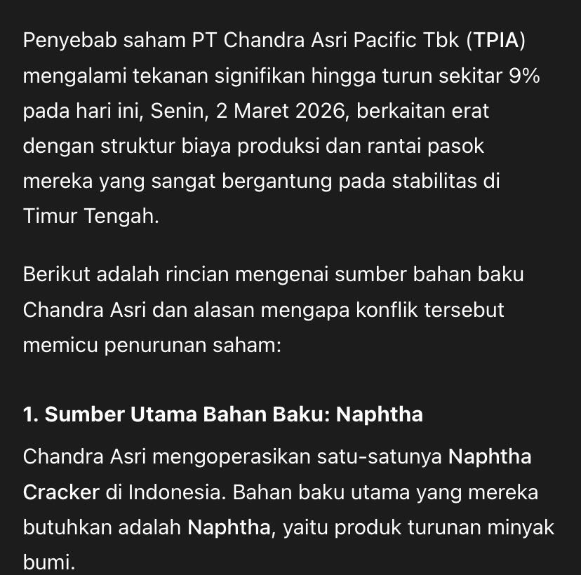 1. $TPIA (Chandra Asri Pacific) – Sektor Hilir & RitelIni adalah emiten yang paling terdampak secara langsung karena posisinya sekarang bukan lagi sekadar pabrik kimia, tapi juga pemain bahan bakar.Keuntungan (Sisi Ritel): TPIA baru saja menuntaskan akuisisi jaringan SPBU Esso di Singapura dari ExxonMobil pada awal 2026. Jika harga minyak naik, margin penjualan bahan bakar ritel di Singapura bisa meningkat seiring kenaikan harga jual di pompa bensin.Risiko (Sisi Petrokimia):