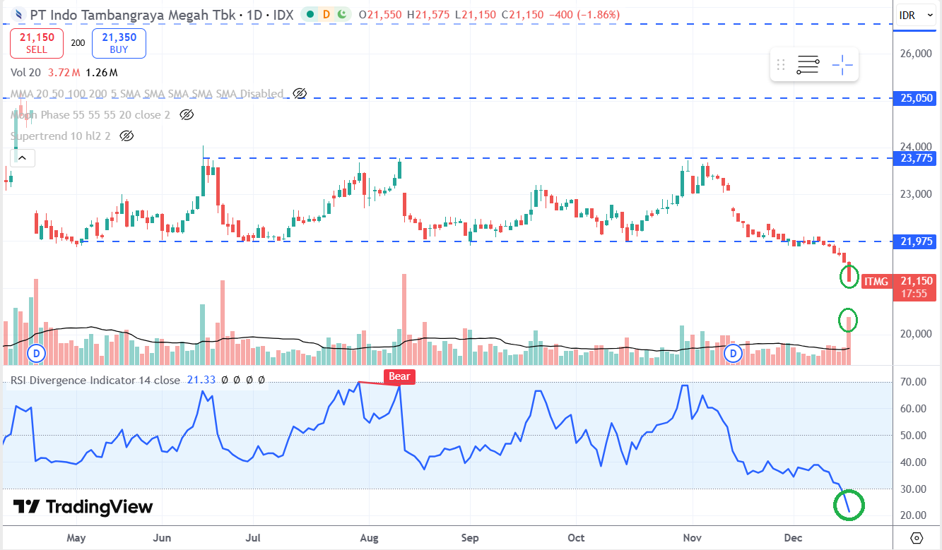 ITMG per closing hari ini sudah masuk RSI OVERSOLD, atau jenuh jual di angka 21,3.