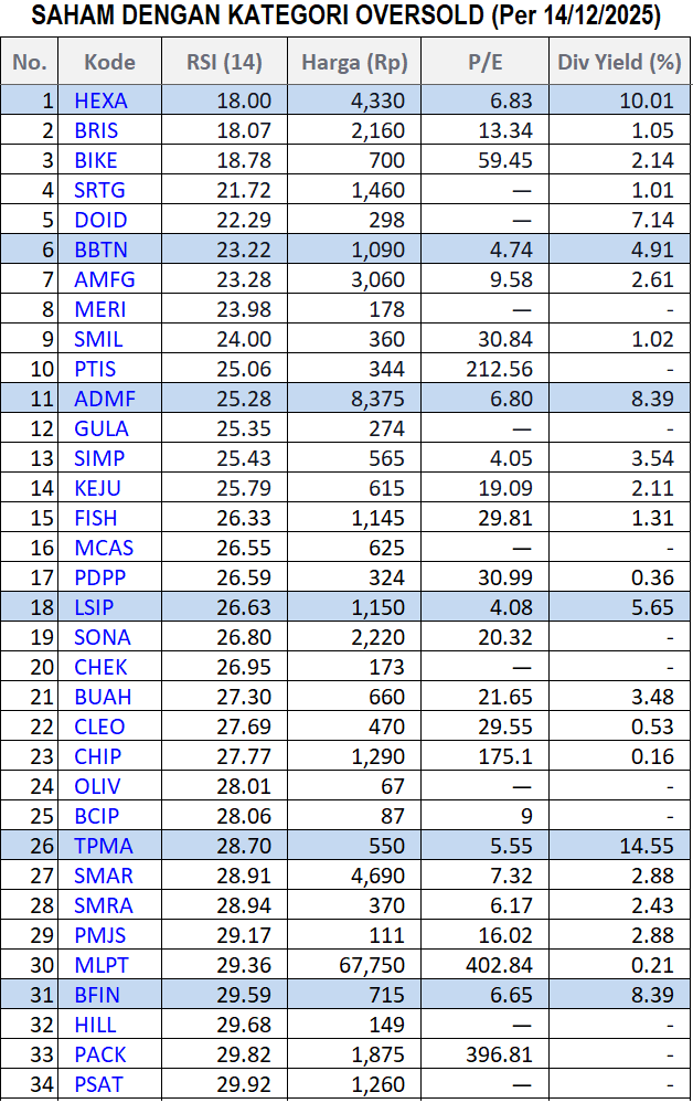 SAHAM DENGAN KATEGORI OVERSOLD (Per 14 Desember 2025)