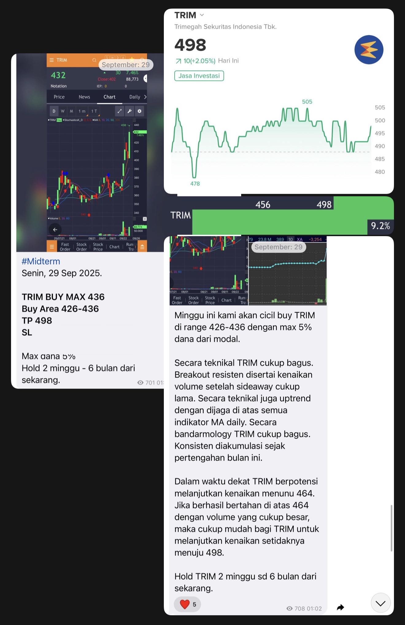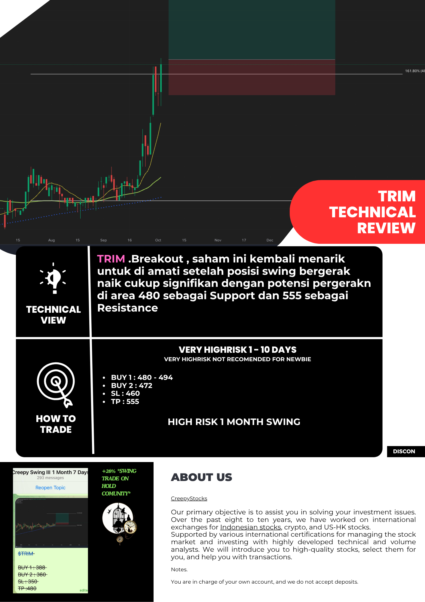 TRIM adalah saham yang sudah cukup lama sideaway. TRIM tercatat sudah 1 tahun lamanya sideaway. Barulah di pertengahan September lalu sahamnya mulai breakout resisten disertai kenaikan volume. Dari bandarmology juga cukup bagus dan konsisten diakumulasi. Untuk itulah kami putuskan entry di TRIM Senin ini dengan rencana hold 6 bulan kedepan.