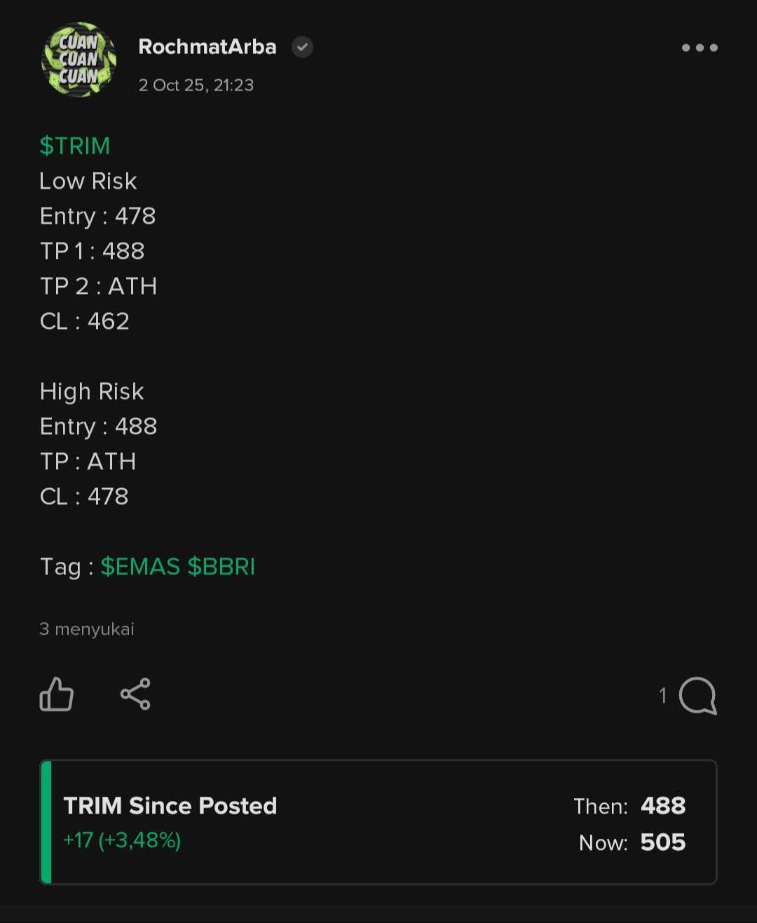 Meskipun rencana holdnya untuk 6 bulan kedepan, namun bersyukur sekali hanya dalam kurun waktu 1 mingguan sudah mencapai targetnya di 498 dengan cuan belasan persen. ๐